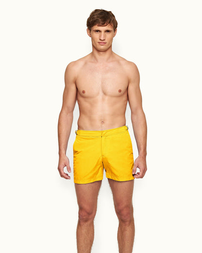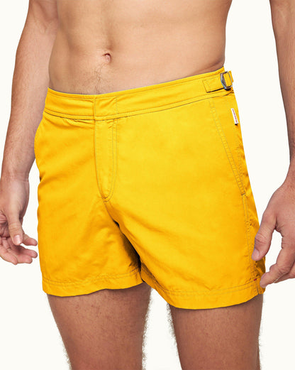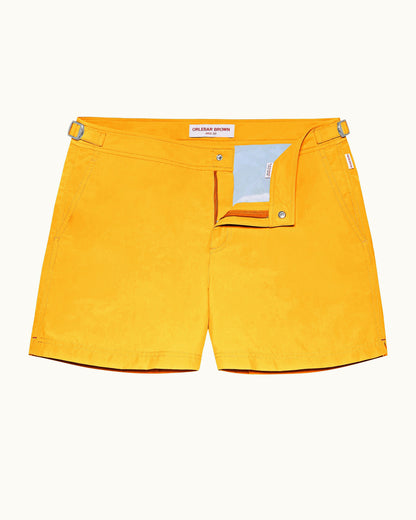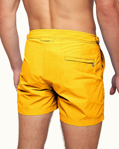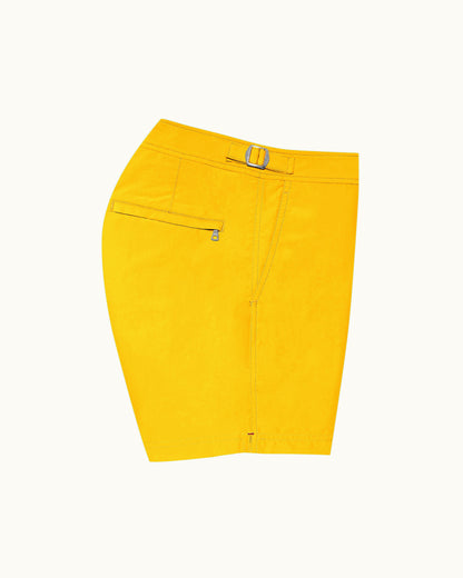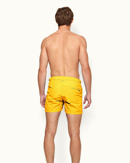 The OB Classic Setter in Yellow Blaze is based on the pattern of a traditional man’s suit trouser – it's not a swim short, but a short you can swim in. The shorter length swim shorts have a perfect fit and signature side-fasteners. With over sixty elements in each pair, OB Classic swim shorts are made from 100% recycled plastic.